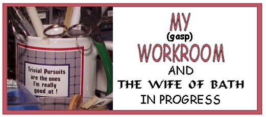 This shows the right end of my work table. Embarrassing amount of clutter, but never can seem to keep it presentable. The dark red silk in the package was the fabric for the Wife's dress. I found it at Pam Kille's Etcetera, Etc. table at a great price.