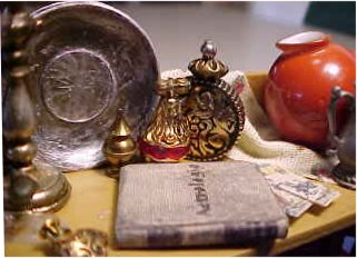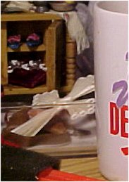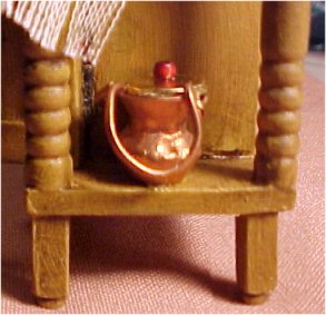 The "pewter" plate standing at the back is a plastic plate from my daughter's old dollhouse! I used a silver paint on it, then an antiquing wash. The orange pitcher is one from a collection of pitchers (not all miniature) that I purchased at an antiques sale in the basement of a church in a small New Hampshire town. Another of those pitchers is shown in the Kitchen Box in the Smaller Shadowboxes pages.