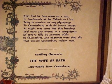 Because anyone not familiar with the story wouldn't have a clue what was going on, I also printed out a booklet, much like what now appears in The Wife of Bath page on my website, that gives the background of the story. It lay in front of the display. Even those who know The Canterbury Tales wouldn't necessarily have known about many items included in the scene that resulted from weeks if not months of research. Frankly, I don't know how many actually read it, although several people told me they had.