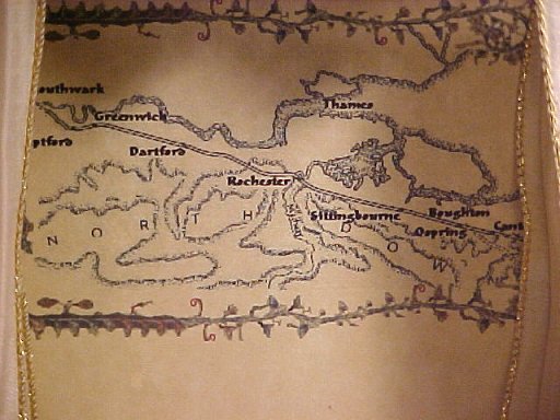 On the back wall over the wife's bed is a map of the pilgrims' route to Canterbury (parts of which are obscured by the curtain). I also used the flower and vine Ellesmere MSS motifs there.