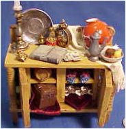 I enjoyed making this wine cabinet; it contains so many items relevant to the story. I bashed another piece of furniture to make it, redoing the legs, using cardboard for a raised backing board, changing out the latch, repainting and antiquing it for an old oak finish.