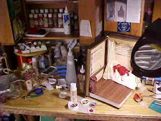 The opposite end of the room is my husband's domain, where he works on his mountain bikes. Poor guy, it also contains rows of bookcases holding my mini magazines, books, wallpaper sample books, and all kinds of containers for future scenes, etc. My stuff always seems to take over.