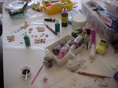 NOTE: They made far more cookies that week than they wanted to use. Since they were varying shapes and sizes made from baked white Sculpey, I just threw them in a box to use in future projects as mini stepping stones and ... who knows?