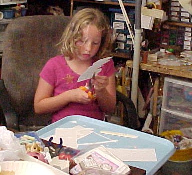 Now she cuts out her box, sitting in my chair at my work desk. Notice the blue tray? I pull out the drawer and place a tray or cutting board atop it when I want an extra work space. I tend to need this since all my work spaces fill up far too easily. lol