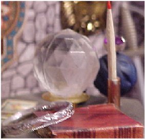 Here's a closep of his crown, the crystal ball, book and candlestick.
