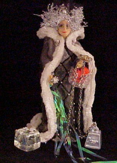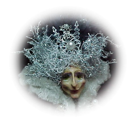 Fluenza was originally an elf which I was working on for a contest on the MiniDolls list, but he kept telling me he was a she. I finally gave in and as I stripped off his hat and hair, my eye fell on a strange little glittery tassel that I had purchased in the after-Christmas sales. I plunked the tassel atop the elf's head and bingo! That elf wasn't kidding! He wasn't meant to be an elf; he WAS a woman, and a rather mysterious one at that - and that glittery tassel became her hair.