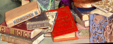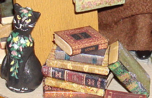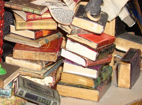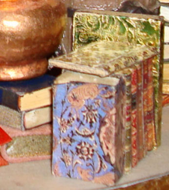 Oriental rug advertisements made great book designs, as did foil gift wrap papers. I used eye shadows and chalks, even a stain pen, to tone down the shine on these papers. I did add some of my recent books to the scene, placing them so they would partially conceal the older ones that still looked too shiny. These are old books, after all ...