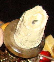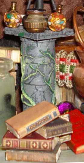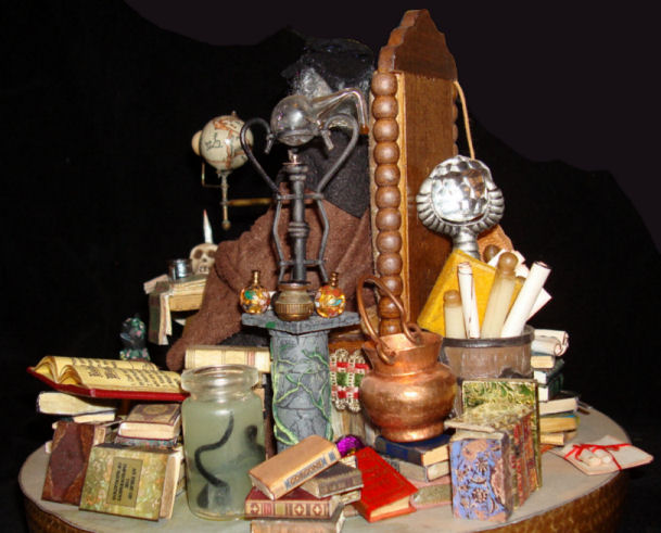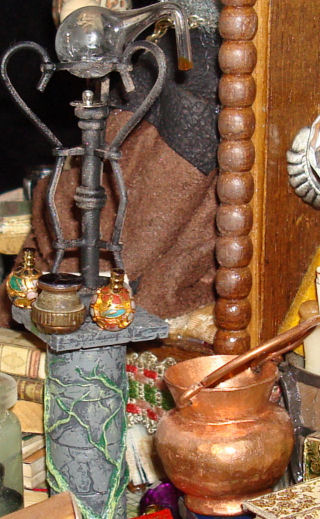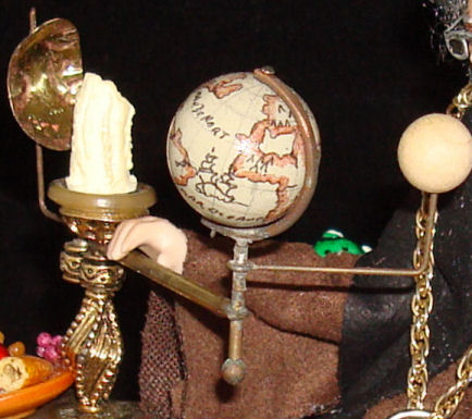 The orrery table was a WalMart purchase many years ago that I repainted. The table rug was in my stash and it added a bit of needed texture and color, but if I had had any idea it would be so diffult to manipulate I would never have used it. I would glue and glue and press it in place and think it was okay, and then the next day it would have sproinged back out. Too bad my Super glue was all dried up! Unfortunately, I already had other things glued on and around the rug, so it would've been a real chore to use something else. Oh well; I guess it's not too unusual to have a rug go awry, considering how many of Anachronon's -and my - other projects do.