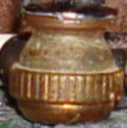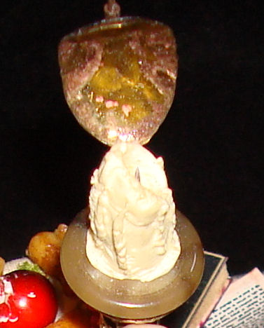 The crystal ball held by the pewter talons was actually part of a necklace that I picked up somewhere; frankly it was so heavy I couldn't imagine anyone actually wearing it. When I removed it from its chain, it wouldn't stand up on its own, but did tuck nicely into the bucket with the knobbed scrolls, a Christmas Nativity piece that I toned down with chalks.