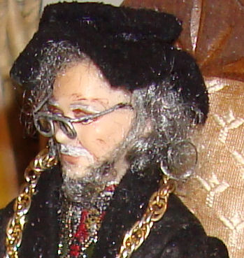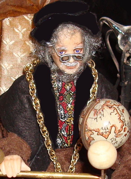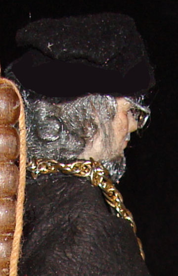 I felt a lot better when I made the Leonardo Da Vinci type hat, but I could not get his porcelain parts to look as natural in posture as I wanted. I put him away for quite a while and when I got him out again, he didn't look so bad, after all, and with the addition of glasses he finally became real for me.