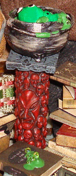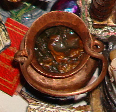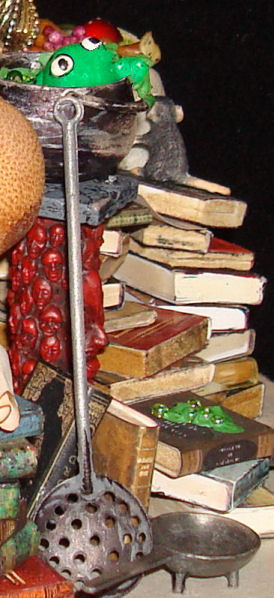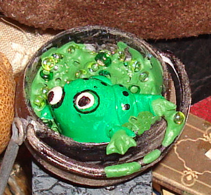 The strange cat was made by Charles Claudon way back in 1982; I purchased him recently from Dick Tabor. The peculiar little frog without a nose or mouth is crawling out of a pot with boiling bubbles made from beads. The metal pots, Anachronon's mug and the ladles were in the stash for my medieval kitchen.