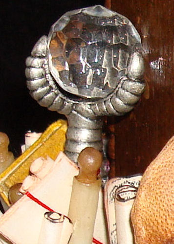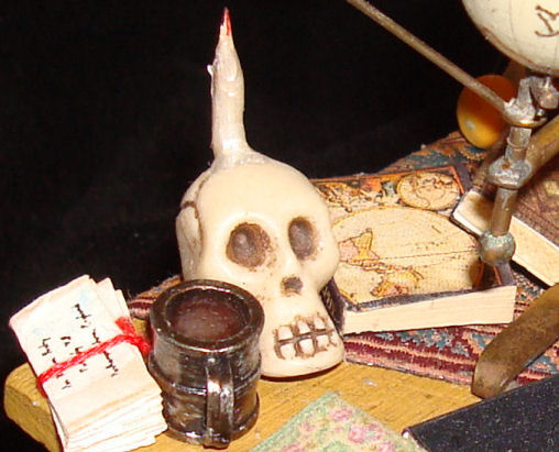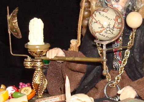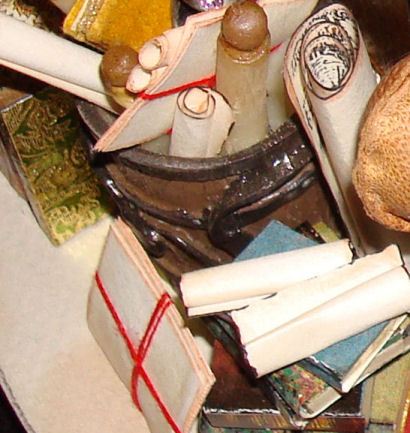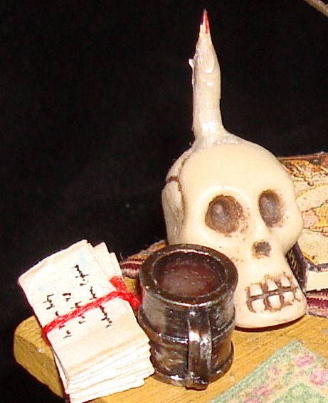 The letters and most of the other papers and paper scrolls throughout the setting were made by Suzy Q. I won a contest on the MiniDolls list and received as my prize a fabulous collection of scrolls, letters, open pages, maps, etc., from her. I STILL have a few paper items left that I can use in future collections. What a fabulous contest win that was!