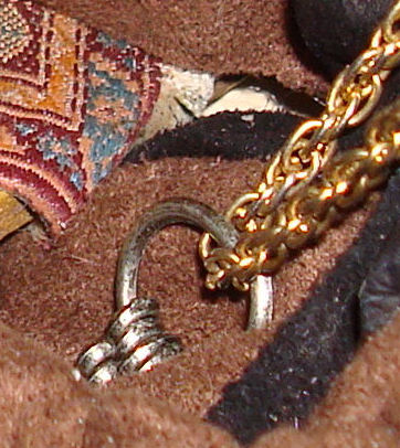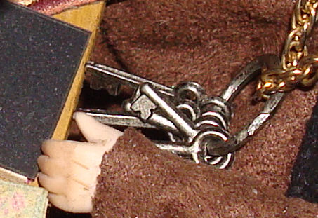 Anachronon existed in my imagination for a long time, but when I first created him in January 2011 I was quite disappointed. The kit included fabric for a blue robe and wizard's hat which did not work for me at all. I deliberately re-made him in more subdued colors of brown and black (the robe's trim and his hat are made of black leather and suede). A bit of color was added with his shirt which I made from a piece of decorative ribbon. He was originally wearing a different necklace, but when I came across the keys and the gold coins in my stash, I knew just how I wanted to use them.