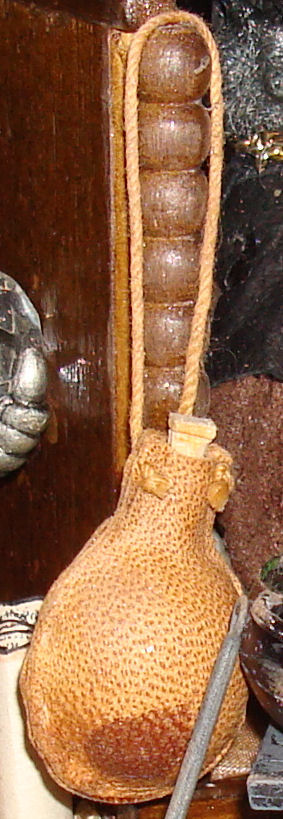 This leather "bottel" is one of a pair made for me by the late Beth Lane, a dollmaker who was one of my earliest mentors and a good friend for well over twenty years. I made her a tub of eels for her castle as my part of our swap. Losing her was very painful.
