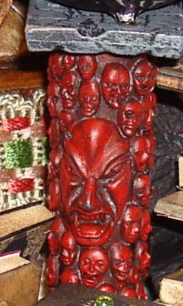 The vine and faces tables were great finds at a comic book shop in Northeast El Paso once. The chair was an old cheapie purchased in the 80s which I heavily sanded to get rid of its too-shiny finish and gussied up a bit with a fabric cushion and fringe trim. I toned down the fabric by going over it with a Golden Oak stain pen!