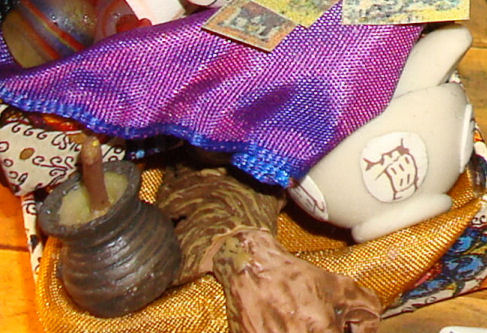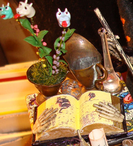 The jug was in my stash. The Poison Herbs book (which has real pages with pictures) is from Heather Cutting-Rayl in Albuquerque, NM, and the pumpkin was made by Diann Shull of Canada.