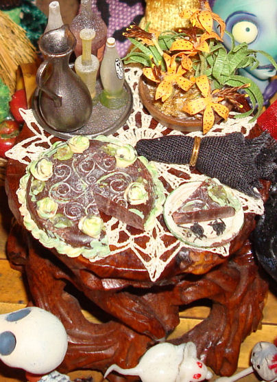 In addition to the trunk and the chest-of-drawers, my other main piece was a "writhing wood" table which was in my stash, just waiting for the right place; not sure where it came from. I hated to cover the top, which looked like a cross-section of wood, but some contrast was needed with the darkness of the chocolate dessert, so I added a piece of needlework which I purchased at the Dona Ana Doll Show and Sale held recently in Las Cruces, NM.