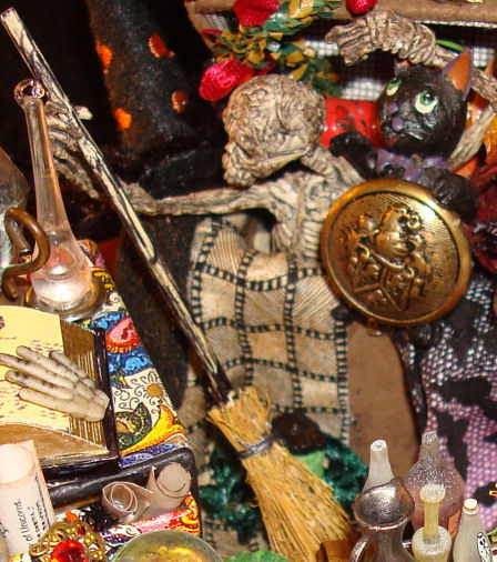 I don't recall where I got my Skellie Sweeper; he is only an upper body. He was the first thing I placed in the trunk. He was already posed this way and it worked out perfectly so that he could hold the broom with one hand and raise the lid of the trunk with the other.