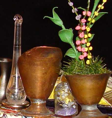 The bottle was actually a pendant from a strange necklace that I think came from a box of jewelry at a secondhand store. I also found the wonderful brass pitcher and bowl pieces at the doll show. (A great haul that day!)