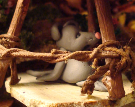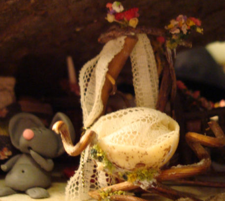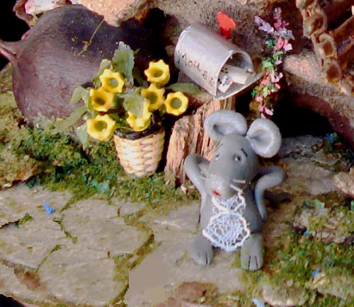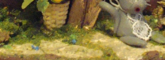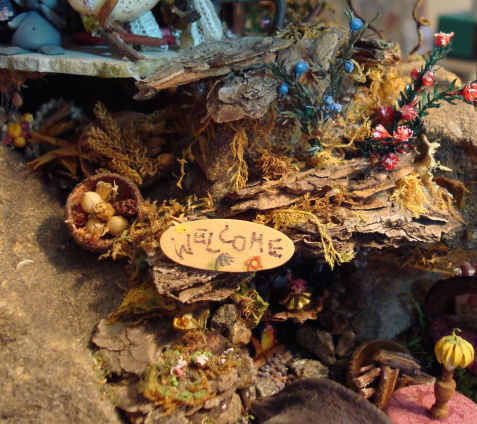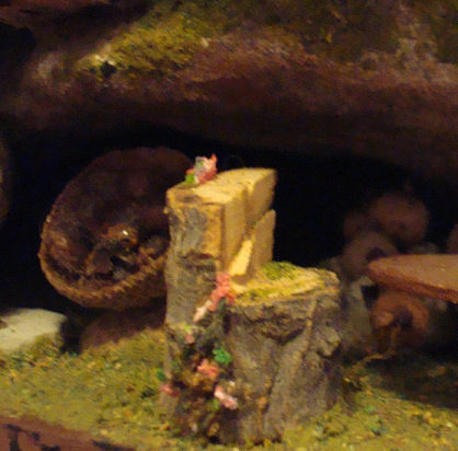 This mouse house in a holey rock (the holes resulted from bubbles caused by volcanic activity eons ago) originated in a Pete and Jackie Steele workshop at a Southwest Roundup in Tucson, AZ. It was completed ten or twelve years ago, but I recently decided to update it. When I was working on Mother Goose's cottage, I was looking for an example of where I had used eggshells for stones. I remembered this project, which has always been one of my favorites, and was disappointed to see how much of the natural greenery had faded over the years that it has been in the entertainment center behind glass doors. So, I decided to refurbish the landscaping and finally tell the story of the little mice family.