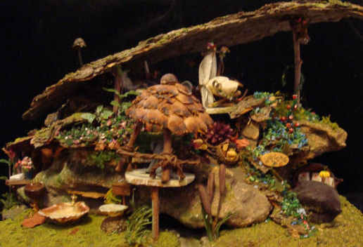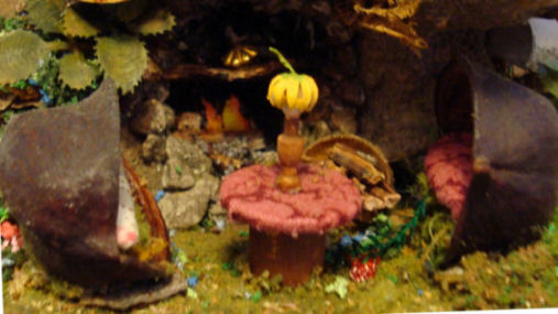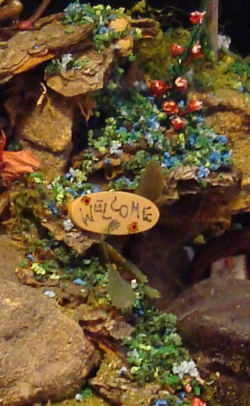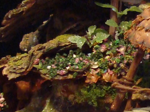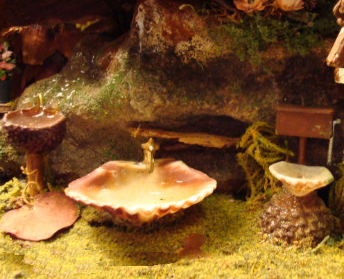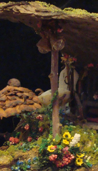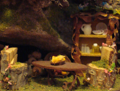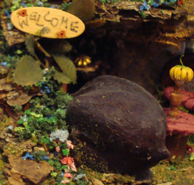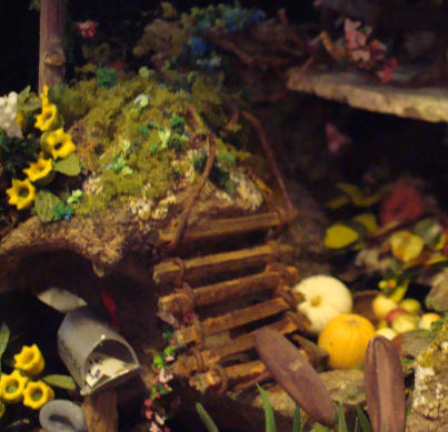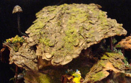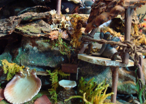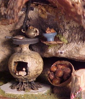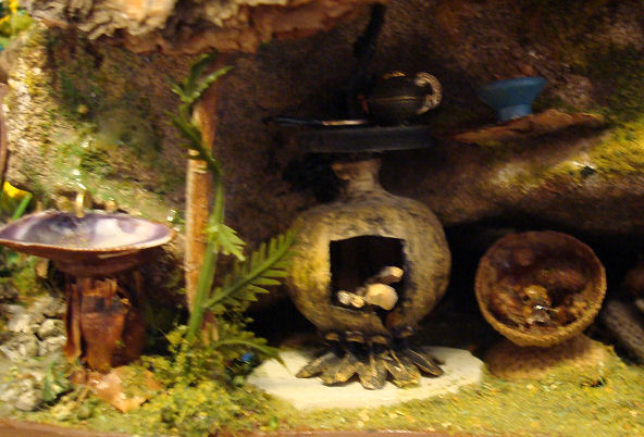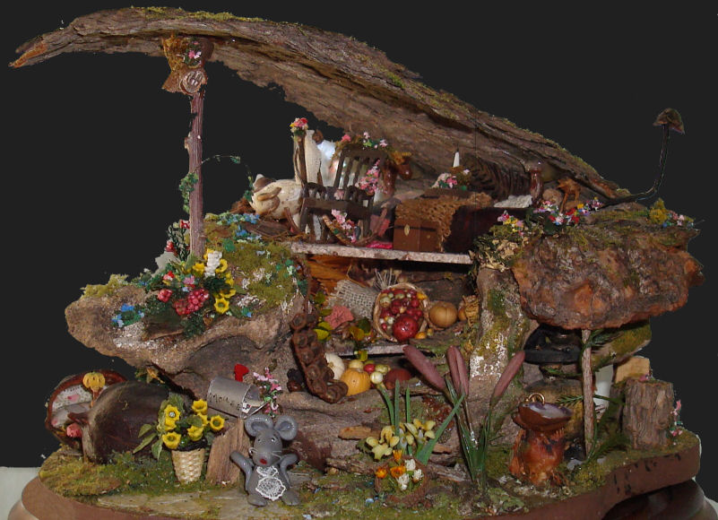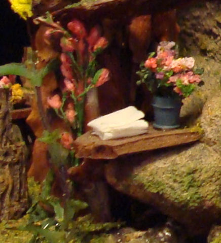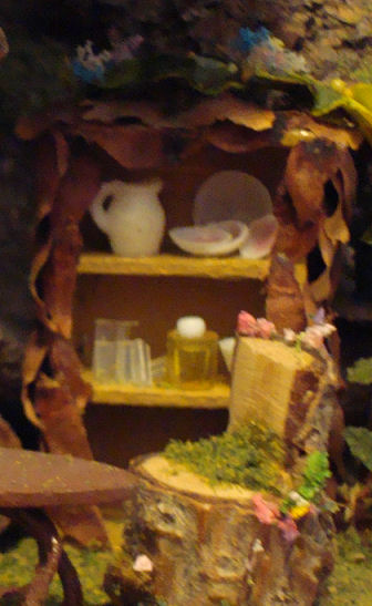 The steps were made with scraps of bark left from the roof piece, as are many of the shelves. Brown floral foam and cardboard pieces were widely used to prop up floors and build up layers, then covered with glue, sand and model railroad landscaping materials, along with dried flowers, lichen, mosses, etc. Unfortunately, much of the dried material did not hold up well over the years, except for the dried flowers in the acorn cup planter, which retained their color.