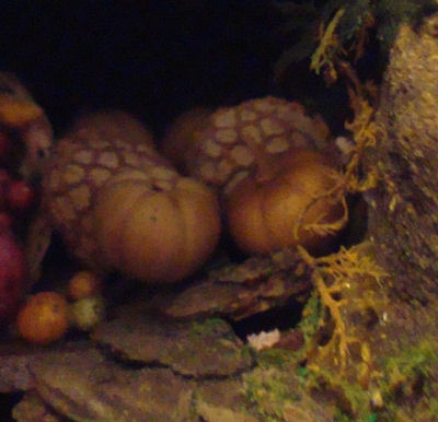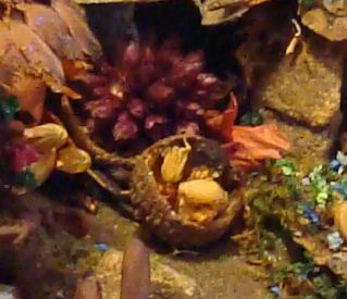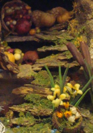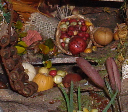 In those days my husband brought home all kinds of little dried plant material from his hikes, much of which I used originally for this scene. I also used items contained in a packet of simmering potpourri mixture, as well as pickling spices, etc. Some dried items held up extremely well over time; for instance, most of the pods; others did not.