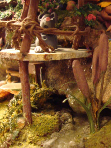 Below and to the left of the gazebo is the bathroom where we can see the mice's ingenious plumbing system at work. My husband explained that water from natural springs within the rock flows down and runs into a cistern under the ledge, then is piped into the appropriate fixtures. Notice how the excess water flows from under the ledge on the upper left, too.