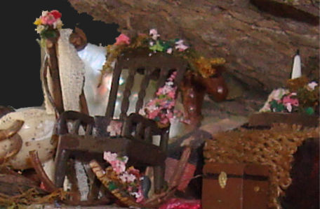 Mama's chair has grapevine rockers and a little pillow for her back. It is very difficult to tell here, but far back under the roof those are Mama and Papa's beds separated by a table in the center.