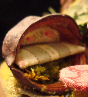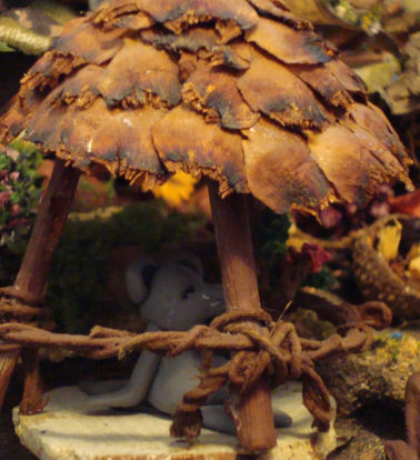 The teakettle and skillet were made from tiny jewelry findings. The blue vase in the bathroom is a painted necklace fastener. The little blue bowl on the kitchen shelf is from a package of BPF, or brown plastic furniture. (You can investigate BPF here.) The cupboard was a quarter scale piece made from a kit; I added the pinecone shingles to make it look more rustic. The storage unit in the kitchen is made with two small acorn caps, one as basket, one as base; another acorn cap forms a planter by the front door.