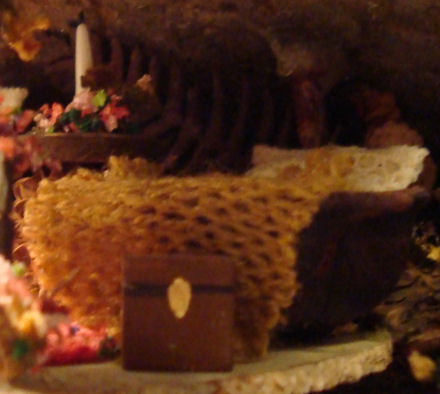 The rock entryway is made with eggshells. A clean empty eggshell is flattened onto an index card covered with glue. A stain is rubbed on, then off, and the excess card is cut away. I think this was two cards' worth of eggshells. (You can see this technique in process in the how-I-did-it for Mother Goose's Cottage.)
