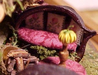 Here is a view of one of the sofas in the sitting area. It is also made from a bottle brush tree pod turned on its side. The wood in the acorn cap to the left is for the sitting area fireplace.
