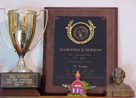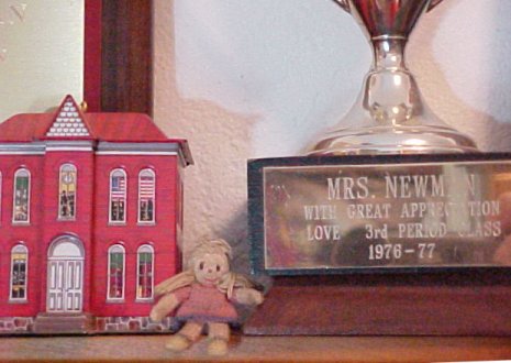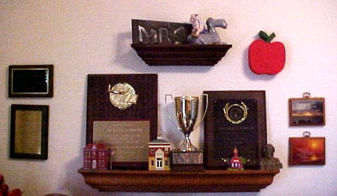 This arrangement is on the wall over my computer station. Besides the school plaques, there are other personal items relating to my career that have special meaning. The loving cup was a gift at the end of the 1976-77 school year from the best English III class I ever had.