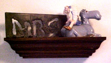 On this little display shelf you see an iron Mrs. plaque that one of my students made for me in his welding class. It sat on top of a bookshelf for the rest of my teaching career, along with the fellow in the headdress who seems to be having difficulty knowing which path to take.
