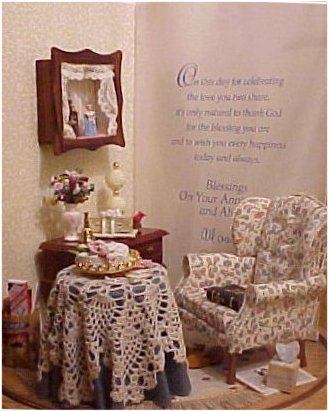 To give the card more stability, I inserted cardboard inside the folds, and glued a piece of wallpaper on the left side, covering the Happy Anniversary, so that I would have a clean wall. The chair I made in a DeeVee Chasteen (I hope my spelling is correct) workshop. The Bible on the cushion reflects their devotion to their faith and church, and our uncle's slippers, newspaper and ever-present box of Kleenex are on the floor under the chair.