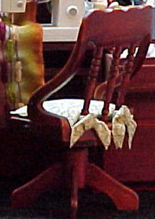 The desk was originally very shiny, as was the chair. I sanded the heck out of both of them to make them look as if they'd been around for a while, and like the look much better than all that gloss. I added the cushion and ties to the chair seat.