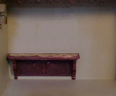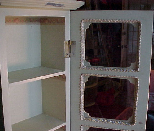 The cupboard was nicely finished on the inside, including the trim around the interior windows, so all I did was add a wallpaper border for a bit of color and to establish a mood. There are some scuffs on the exterior, but I think they were deliberate, to make it look old. Whatever; I'm going to leave it just the way it is.