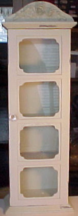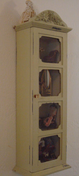 It is very difficult to take good pictures once items are glued into a container such as this cabinet, especially when it is in an interior hallway where the light is not all that great. Notice that my reflection is captured here! Thank goodness I remembered to take pictures while I was working on it.