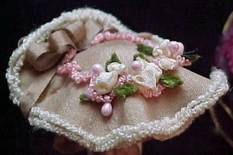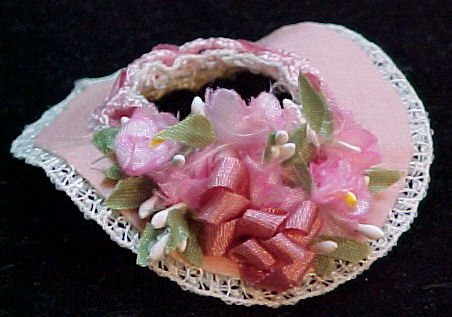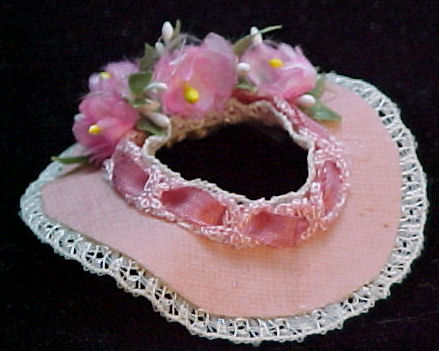 "At one time there was a large fluffy pink feather on this hat," Miss minnie said, "but it got a bit frayed over the years so I just removed it. I made some new flowers using circles of pink organdy."