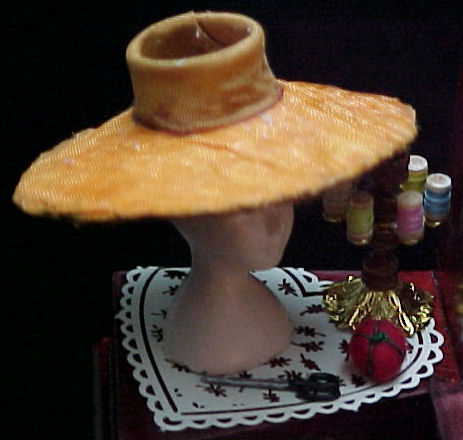 This hat on the pillar is one of the earliest ones I ever made. A piece of fabric used for making draped bows and such was sandwiched between two layers of silk and while the glue was still damp I molded it around the top of a hat stand.