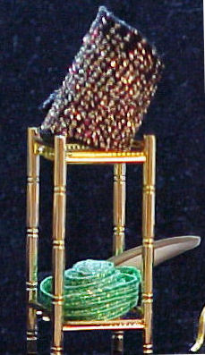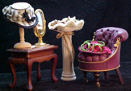 My plan was to use the bottom floor as the work area, and each of the other floors would have a chair, table and mirror so that the buyer could try on hats in comfort. This provided another opportunity to display more of the Reine Take-A-Seat chairs that I have collected.