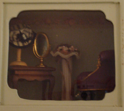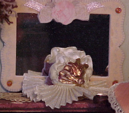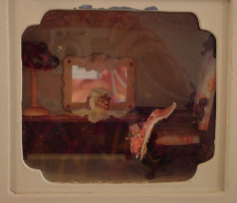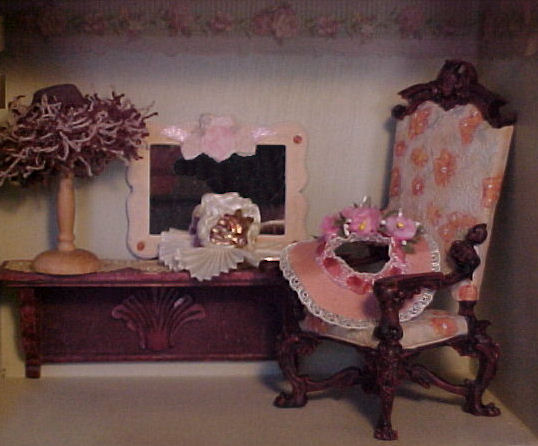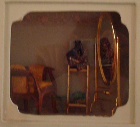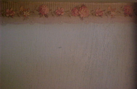 I think the mirror came from my used-up Merle Norman makeup compact. The frame is from the same package of vintage-looking scrapbooking stickers that I used for the wallpaper border. Although it isn't visible here, I added another mirror made from another sticker frame on the left wall, too.