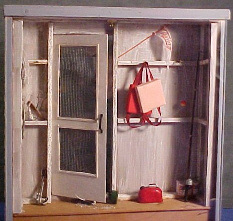 Unfortunately, over the years I have lost the information as to who its talented creator was. It is classy work with great details, from the damp footprints on the dock to the fish scales on the floor inside the boathouse.