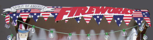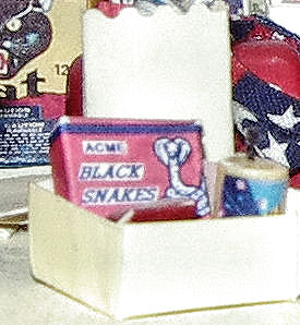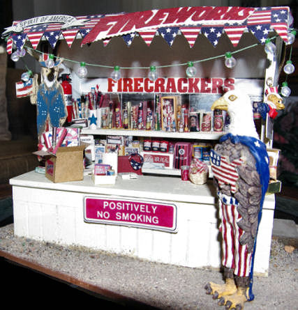 This sign, Spirits of America, which provided the name for Miss Minnie's stand, was on the backing for some item I purchased one year. The item is long forgotten, but I still had the packaging when I made this scene. The red fireworks sign was contrived; I think I used pinking shears for the edges - this was in the days before all those decorative scissors were available, or at least before I thought I could afford them, if I even knew they existed!