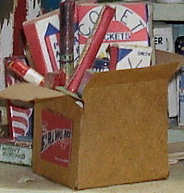 A few of the fireworks were from kits, like some in this carton. Looking back on it with the passage of time, I wish I had used my own creations in the box, as well, because frankly I think they are a lot better. They were made from a variety of large beads, drinking straws, and paper cylinders, cubes, cones and boxes in various sizes, with pasted on labels.