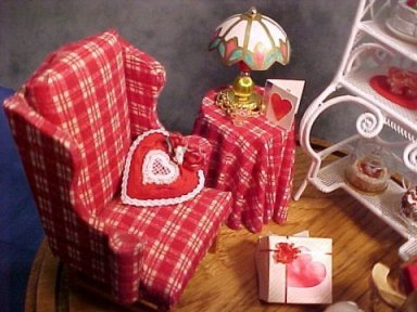 I don't have a closeup, but the little Cupid on top of the wire wicker stand is made of Fimo. The pink straw heart candy box and candies were made in a club workshop conducted by Billie Haynie, daughter of Karen Stull. I made the padded picture frames and gave them to club members as little gifties. We made the little shopping bag from miniature heart wallpaper one year.