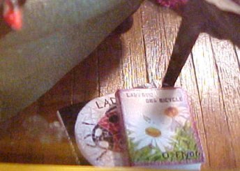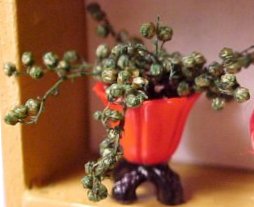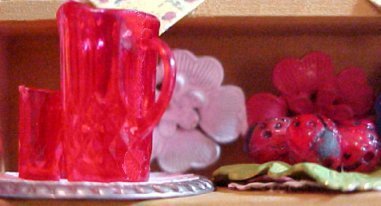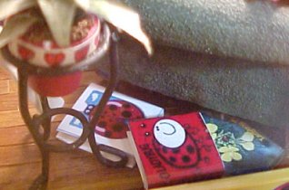 The red and black pot on the bottom shelf is contrived with parts from a little girl's hair ornament. The plant is dried greenery. I decided to keep it, since the plant's shape echoes the shape of the ladybugs.