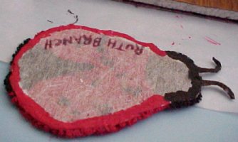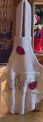 The ladybug apron was a gift a long time ago and was really neat. However, it was made of quite thick fabric that resisted any kind of natural draping. I decided to try to make it a bit more realistic as a hanging apron, so here it is, pinned to form, ready to spray with Stiffen Stuff. Notice I used paint brush handles to help form natural looking folds. It was still pretty resistant, but looks much better now hanging at the end of the hutch.