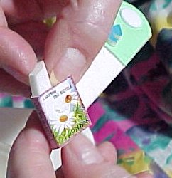 As I was looking around, I spotted a funny little snap on bracelet made of foam which had been in my Cheap Thrills stuff. Sure enough, the foam was just the right thickness for making the books' pages. I peeled away the green backing and cut the foam pieces to fit. (See WANNA BOOK? Book Covers here and a mini tutorial where my granddaughters make up these books here.)