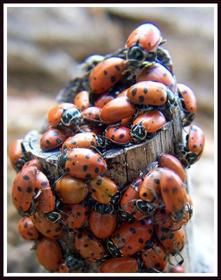 "Well, in my friskier days I used to be quite athletic. One winter I was hiking in the mountains with my friend Hans (ask me about him some time!) and we came upon this red-orange-y mass of what I thought were wildflowers. Imagine! Flowers growing in winter! But it wasn't flowers at all, it was ladybugs, millions of them, clustered together in one vast little orgy there in the crevices and under logs and rocks - all over the place! Amazing! I had thought they were kind of like cicadas. You know - seventeen years in the ground and then one little season of mating, and you're dead? But, it turns out they hibernate in these clusters; don't eat or drink. Remarkable! When you think about the fact that you can fit 80,000 ladybugs in a one gallon ice cream bucket, imagine how many that must have been. Even billions, maybe."