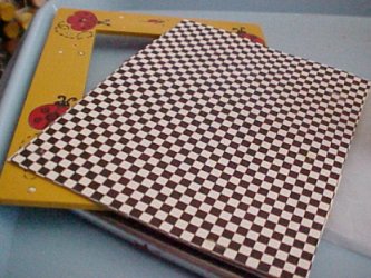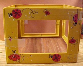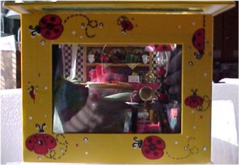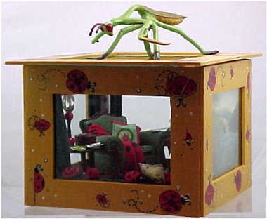 Not long after we returned from Lubbock I was in the dollar store and found some plastic frames with ladybugs on them. Aha! A ladybug setting! I thought. Remembering a Joann Swanson technique of making roomboxes with pictures frames, I bought four smaller frames to form the box and one larger to serve as the top.
